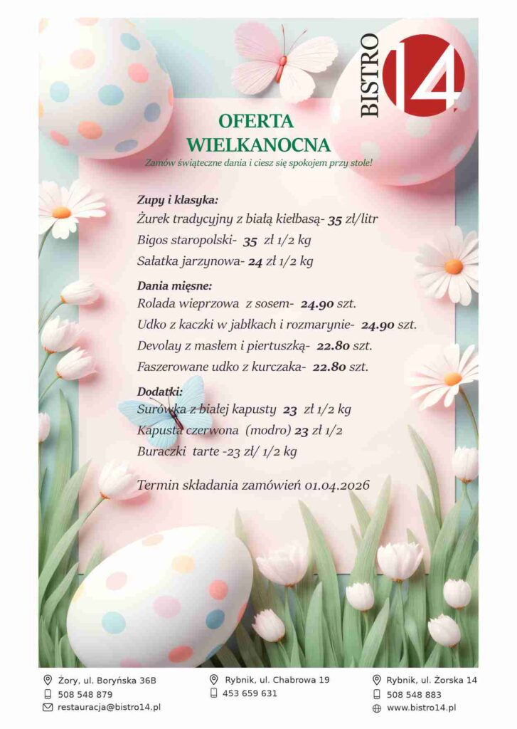 Bistro 14 to restauracja stworzona dla wszystkich, którzy lubią zjeść smaczne, zdrowe, domowe posiłki szybko i w bardzo dobrej cenie. W naszej ofercie znajdą Państwo tradycyjne dania kuchni polskiej, a także specjał restauracji – RYBNICKI SZNYCEL, który zaskakuje rozmiarem i niepowtarzalnym smakiem. W ofercie znajdą Państwo dla swoich pociech pełnowartościowe posiłki i zdrowe domowe lemoniady. Zapraszamy także na śląskie pyszne niedzielne spotkanie z roladą, modrą kapustą i kluskami 🙂
